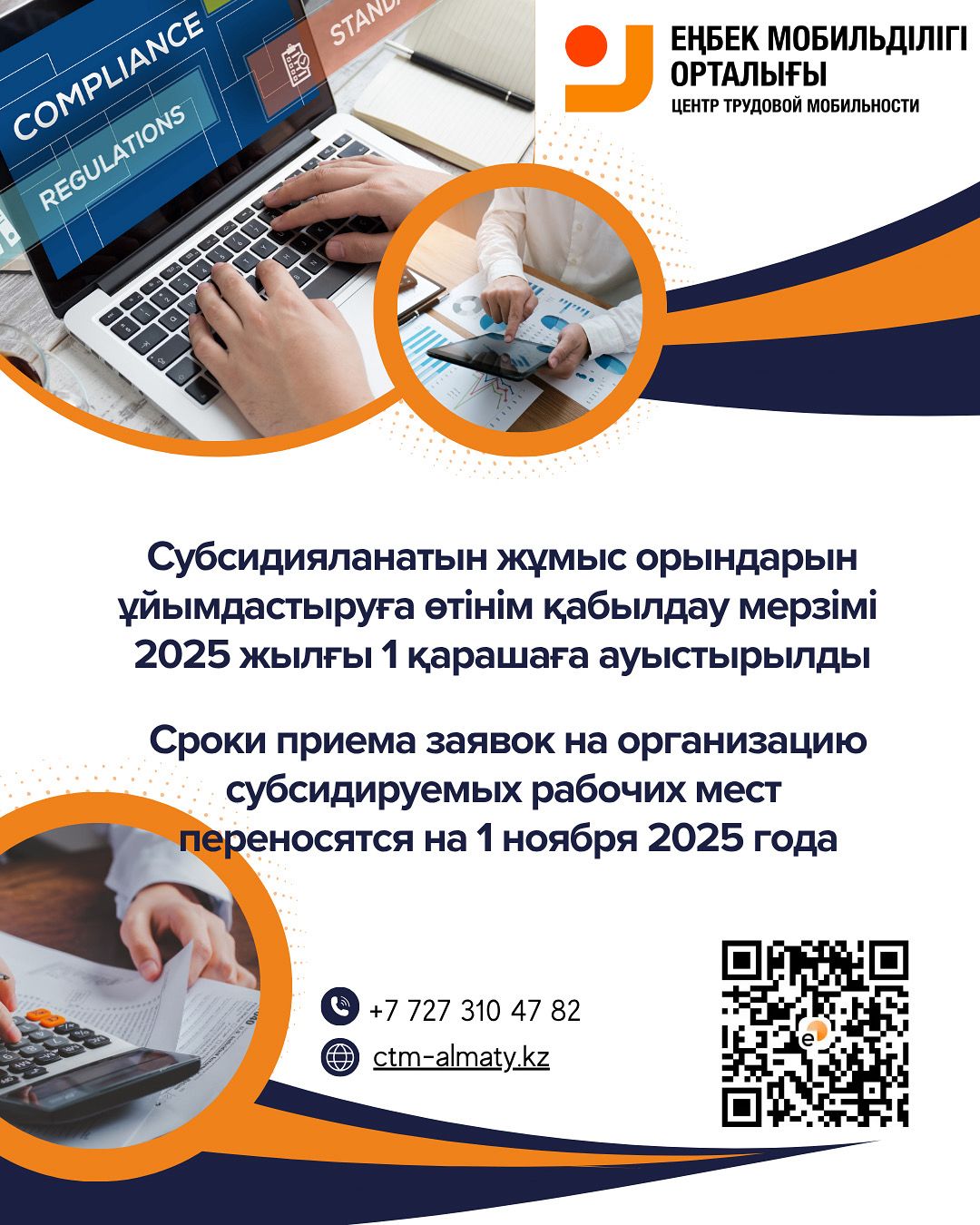 Министерство труда и социальной защиты населения РК сообщает о переносе сроков приема заявок от работодателей на организацию субсидируемых рабочих мест на 2026 год. Новые сроки подачи заявок: с 1 ноября до 31 декабря 2025 года.